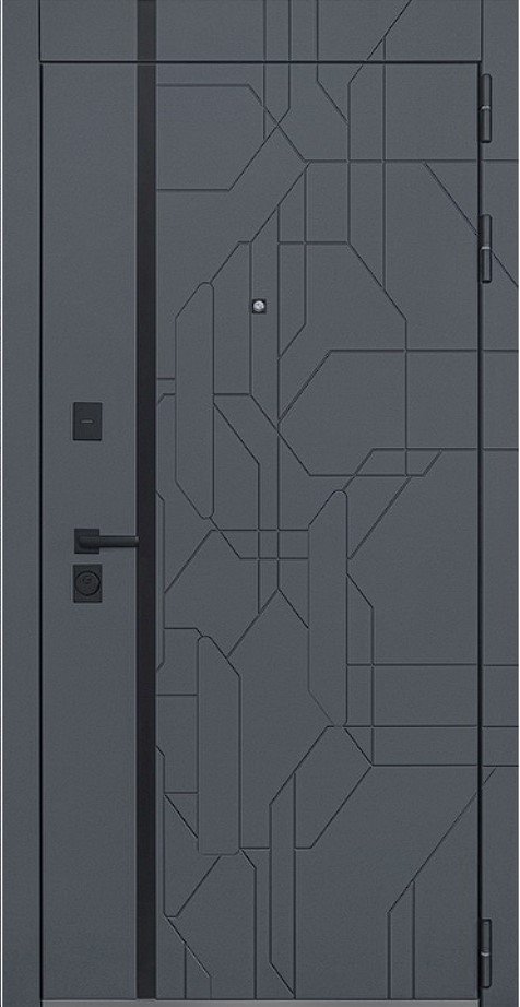 Внешняя отделка ПокрытиеПорошковое покрытие "муар черный". Экошпонированная панель МДФ 10 мм (цвет "графит"). Объемная дизайнерская фрезеровка. Вертикальная вставка из черного лакобеля.